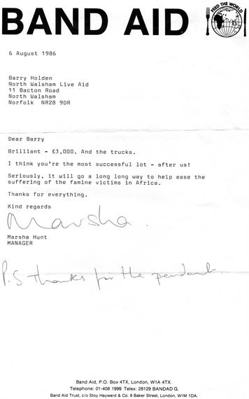 The aim was to purchase two Bedford trucks, fill them with aid and send them to Eritrea where the famine was worst. To raise the £8,000 needed a rock concert was organised at the community centre in North Walsham with 10 bands playing for free and a memorabilia auction with items donated by many stars.