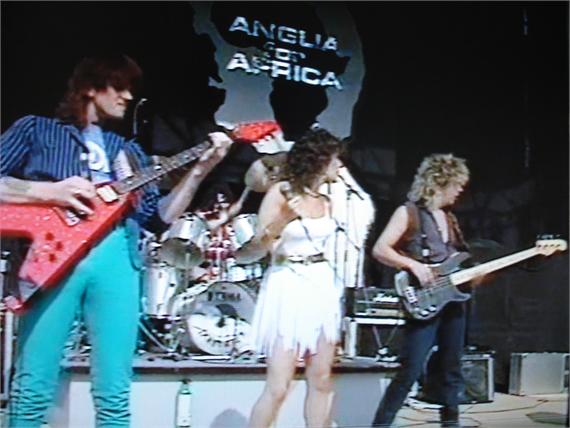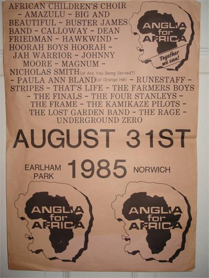 THERE IS VERY LITTLE INFORMATION AVAILABLE COVERING THE ANGLIA FOR AFRICA EVENT THAT TOOK PLACE ON EARLHAM PARK ON THE 31ST AUGUST 1985 THE GIG WHICH WAS SUPPORTED AND FILMED BY ANGLIA TELEVISION FEATURED SEVERAL FAMOUS NAMES FROM THE ROCK AND POP WORLD OF THE TIME , SUCH AS "THE SUPREEMS" AND "HAWKWIND".