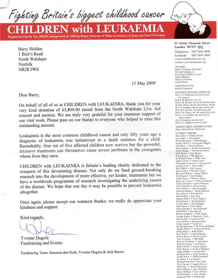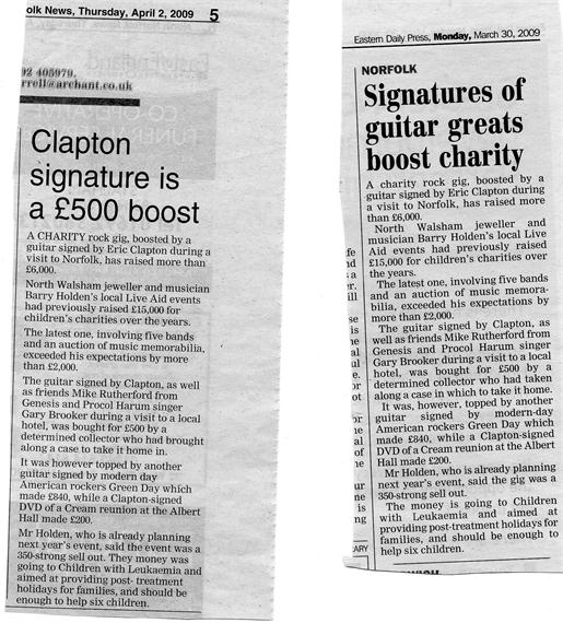 Sat 28th March 2009 was the date of the last gig,which was in aid of CHILDREN with LEUKAEMIA, same venue an basic details 5 bands, memorabilia auction and raffle, special feature is that Barry was lucky enough to meet Eric Clapton, Roger Taylor, Mike Rutherford, Gary Brooker, and Jeremy Clarkson and obtained several signed items for the auction see PICS. Barry also had signed items from Bill Wyman, Thunder, Slayer, Chelsea FC, Liverpool FC. and donated items signed by Elton, George Michael, Velvet Revolver, O.C.C. a very rare sinature of GENE VINCENT and a guitar signed by Green Day WHAT a night it was ULTRA EGO, PINTO, RAW EDGE, CIRCUS AND BEYOND DUPLICATION rocked the venue and combined with the auction North Walsham Live Aid raised £6,000.00 enough to send 5 families to Tuscany for a post treatment break and also sponsor dozens of children for the huge kids party later in the year.