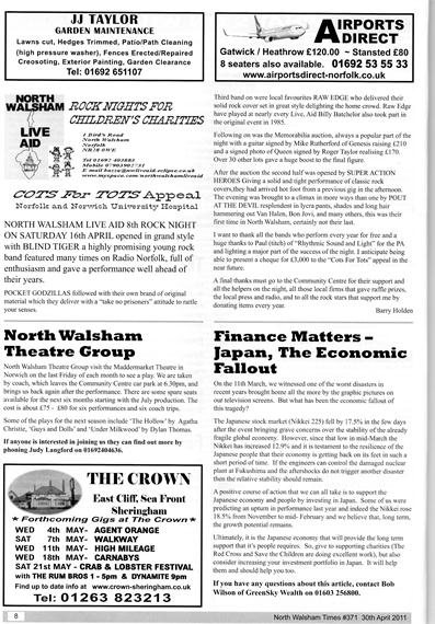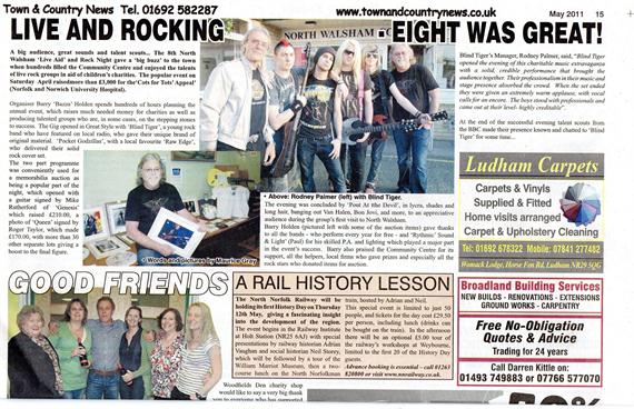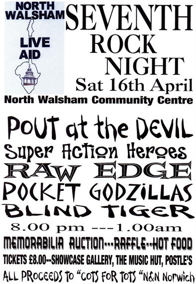 NORTH WALSHAM LIVE AID 7th ROCK NIGHT ON SAT 16th April opened in grand style with BLIND TIGER a highly promising young rock band featured many times on Radio Norfolk, full of enthusiasm and gave a performance well ahead of their years. POCKET GODZILLAS followedwith their own brand of original material which they deliver with a “take no prisoners” attitude to rattle your senses.