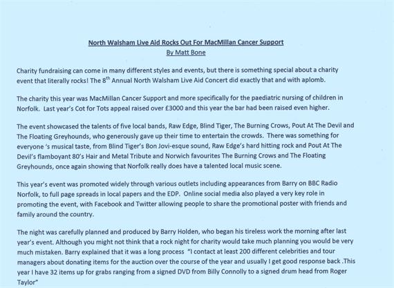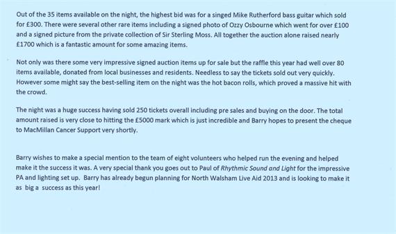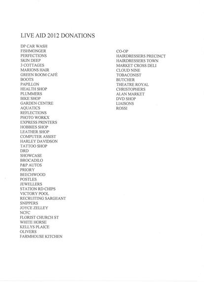Thanks to everyone in the town for raffle prizes and donations and all the those that turn up at the gigs supporting Live Aid year after year