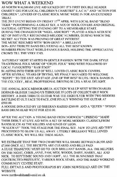 OUR FIRST TWO NIGHT EVENT HELD ON 17TH AND 18TH APRIL 2015 KICKED OFF WITH UP AND COMING BLIND TIGER FOLLOWED BY A NIGEL ASHCROFT ACOUSTIC SET. OUR HEADLINE BAND BON GIOVI TOP TRIBUTE BAND DELIGHTED THE FRIDAY CROWD WITH ALMOST TWO HOURS OF BON JOVI HITS.OUR FIRST SECRET AUCTION PROVED HIGHLY POPULAR WITH THE AUDIENCE.